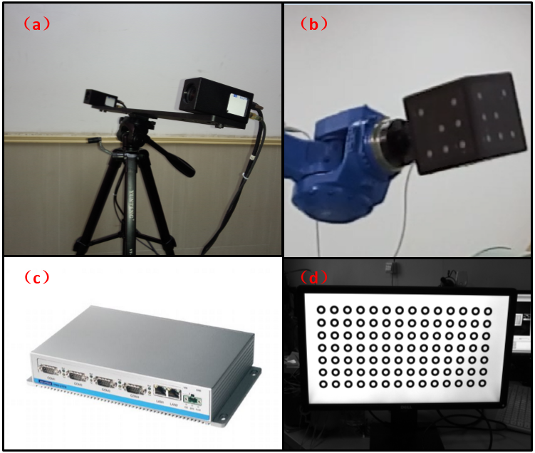 系統(tǒng)組成:硬件:該系統(tǒng)的主要硬件有:兩個(gè)工業(yè)相機(jī)(如圖1(a)),主動(dòng)光立體標(biāo)靶(如圖1(b)),工控機(jī)(如圖1(c)),標(biāo)定標(biāo)靶(相機(jī)標(biāo)定標(biāo)靶+特征標(biāo)靶,如圖1(d))。軟件:標(biāo)定,測(cè)量及機(jī)器人控制軟件平臺(tái)(手眼標(biāo)定,立體標(biāo)靶標(biāo)定,系統(tǒng)測(cè)量精度評(píng)價(jià),測(cè)量測(cè)試,圖像采集及測(cè)量,機(jī)器人控制)如圖2所示。測(cè)量深度范圍:500mm~3000m,測(cè)量視場(chǎng)見表1。該系統(tǒng)能夠勝任以下任務(wù):1)機(jī)器人位置姿態(tài)的實(shí)時(shí)測(cè)量;2)機(jī)器人視覺伺服;3)機(jī)器人參數(shù)標(biāo)定;4)機(jī)器人軌跡姿態(tài)性能特性評(píng)定。