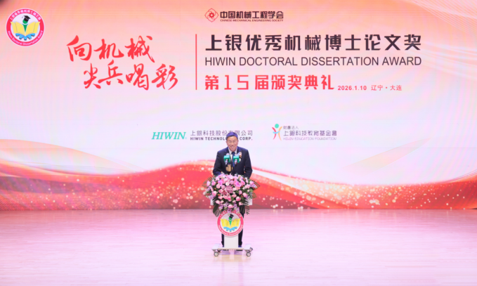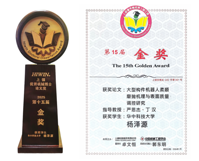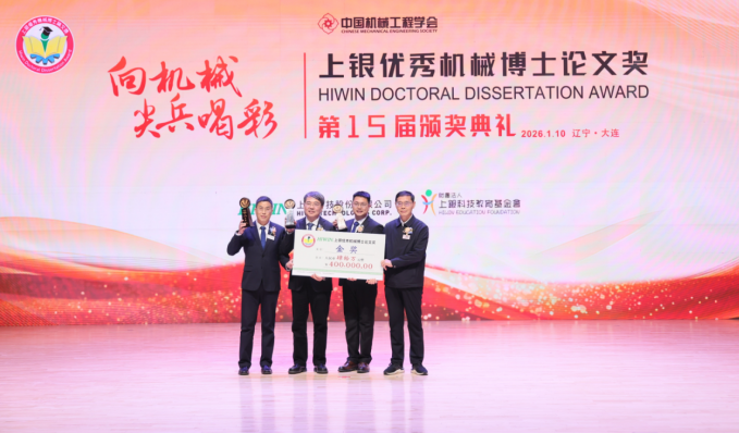 2026 年1月10 日,第15屆“上銀優(yōu)秀機械博士論文獎”頒獎典禮暨2026年機械工程青年菁英論壇在遼寧大連隆重召開。由丁漢院士、嚴思杰教授指導(dǎo),我院與華中科技大學(xué)聯(lián)合培養(yǎng)的楊澤源博士斬獲金獎,實現(xiàn)了華中科技大學(xué)在該獎項金獎上“零”的歷史性突破。該獎項由上銀科技股份有限公司(HIWIN)于2011年設(shè)立,并由中國機械工程學(xué)會組織評選,是國內(nèi)機械工程領(lǐng)域博士論文的最高榮譽。